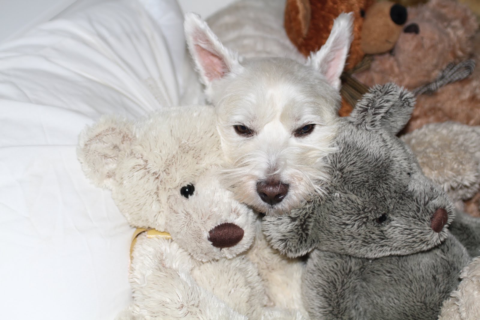 Well, as some of you already know, in the cooler weather, I like to sleep with Her collection of something she refers to as 'the Bears'which, in the past, has been the subject of some disagreement between Her and me although, in fairness, She soon realised that my awesome ability to completely ignore Her when I don't agree with what is being said (it's actually more the fact that most of what She says, I simply don't understand - I'm a dog, I don't actually understand most of Her conversation - key words such as 'walk', 'car', 'beach', 'river', 'go', 'eat' and 'treats' tend to get a good reaction but the rest, it's white noise mostly!) led to me having quite a bit of leeway with the Bears BUT, what with the Arf-an-I-tis, She's decided that sleeping with the Bears is a good thing - it means I'm warm, all the time, and I snuggle right into them so my left leg, which is the Arf-an-I-tis inflicted one, gets extra warmth from the Bears. So, it aint all bad having Arf - in fact, I barely notice it but I'm certainly not above using it to my advantage if need be.